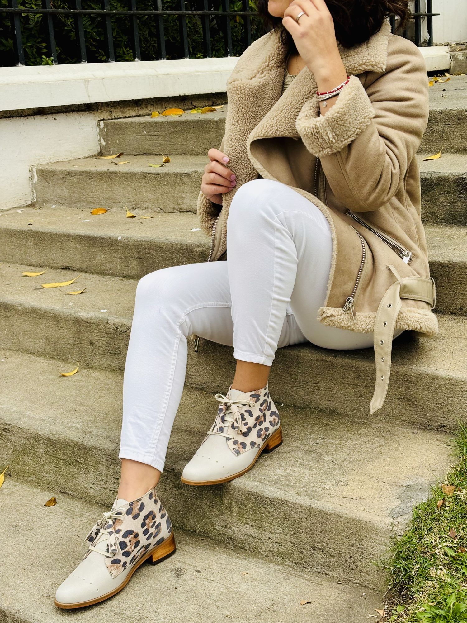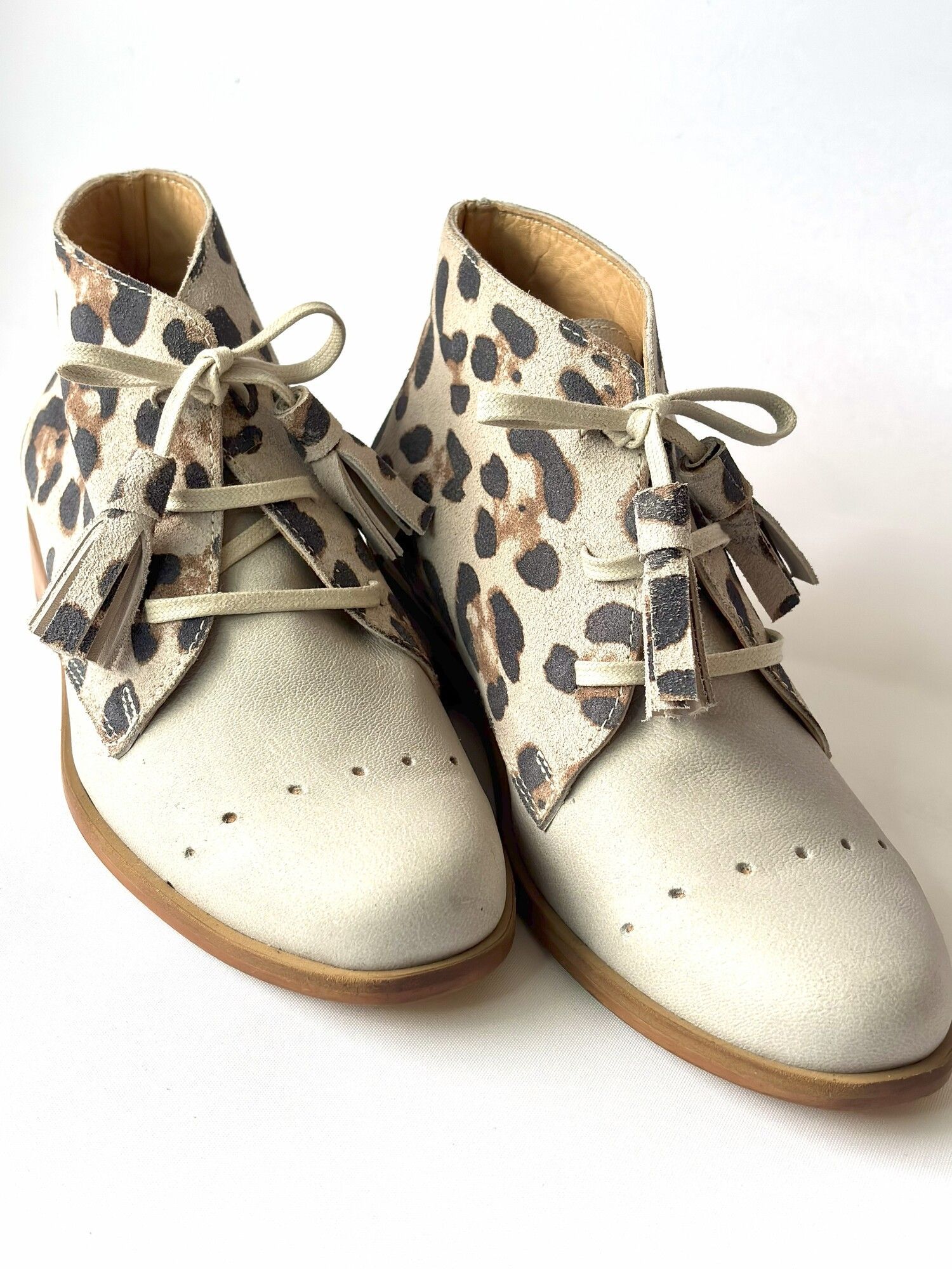 cordones: encerados color hueso con pompones cuero print en la punta