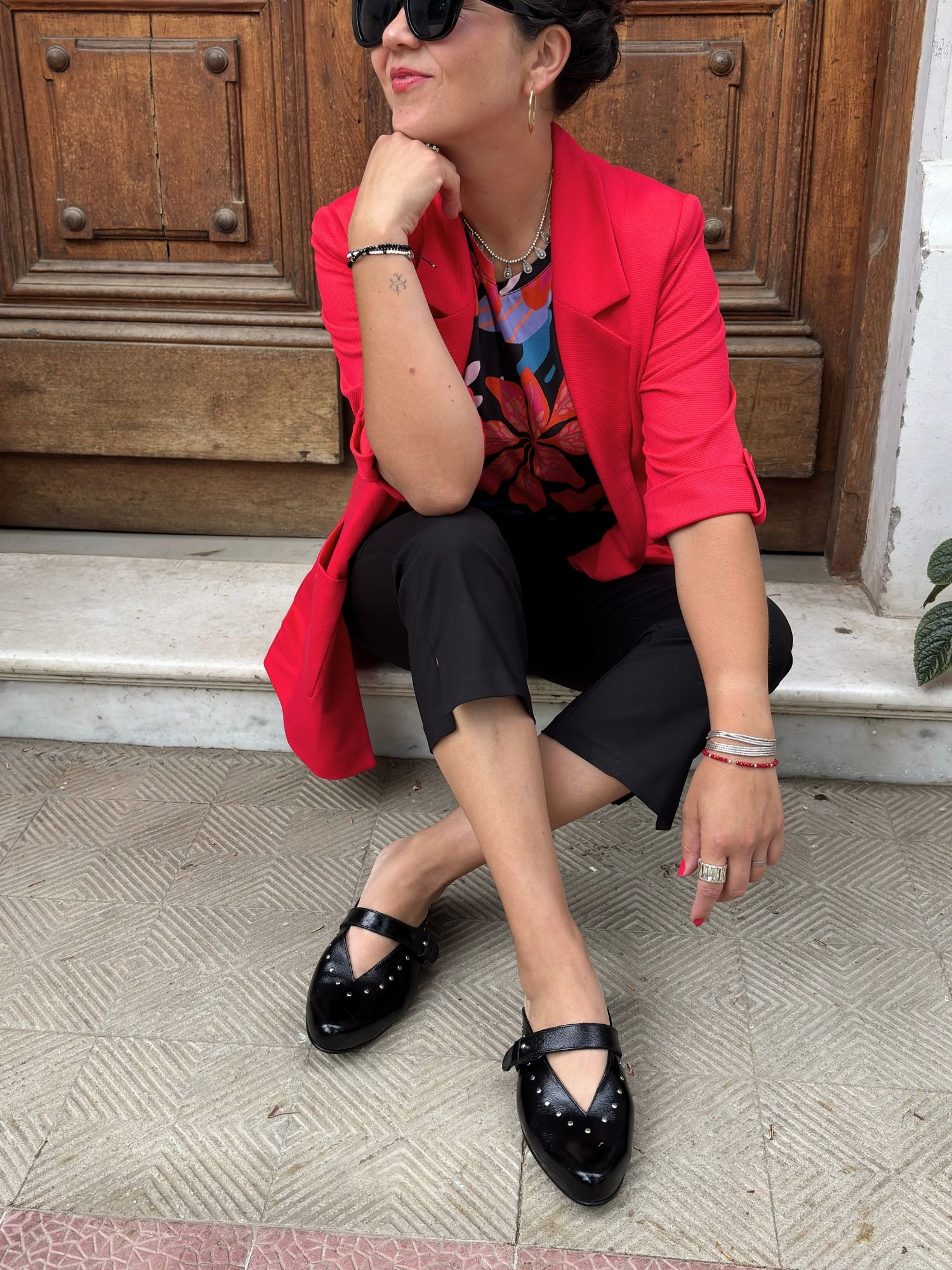 Detalles y Broche: Tachas metalicas en color plata y perno bolita