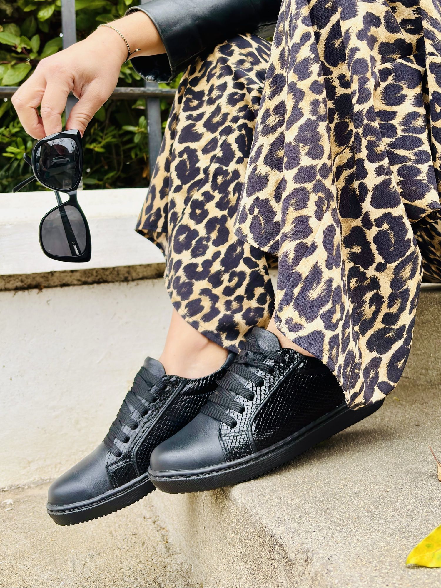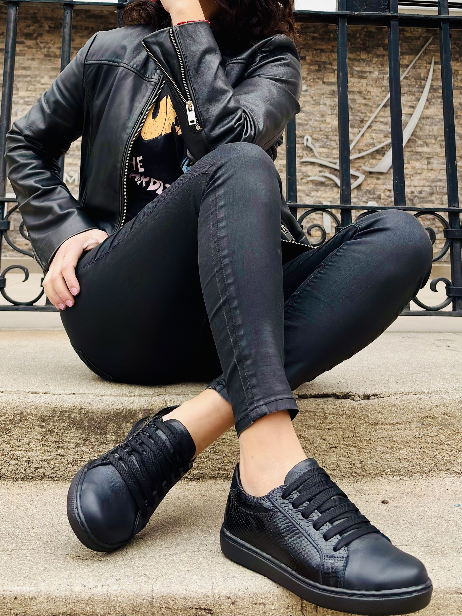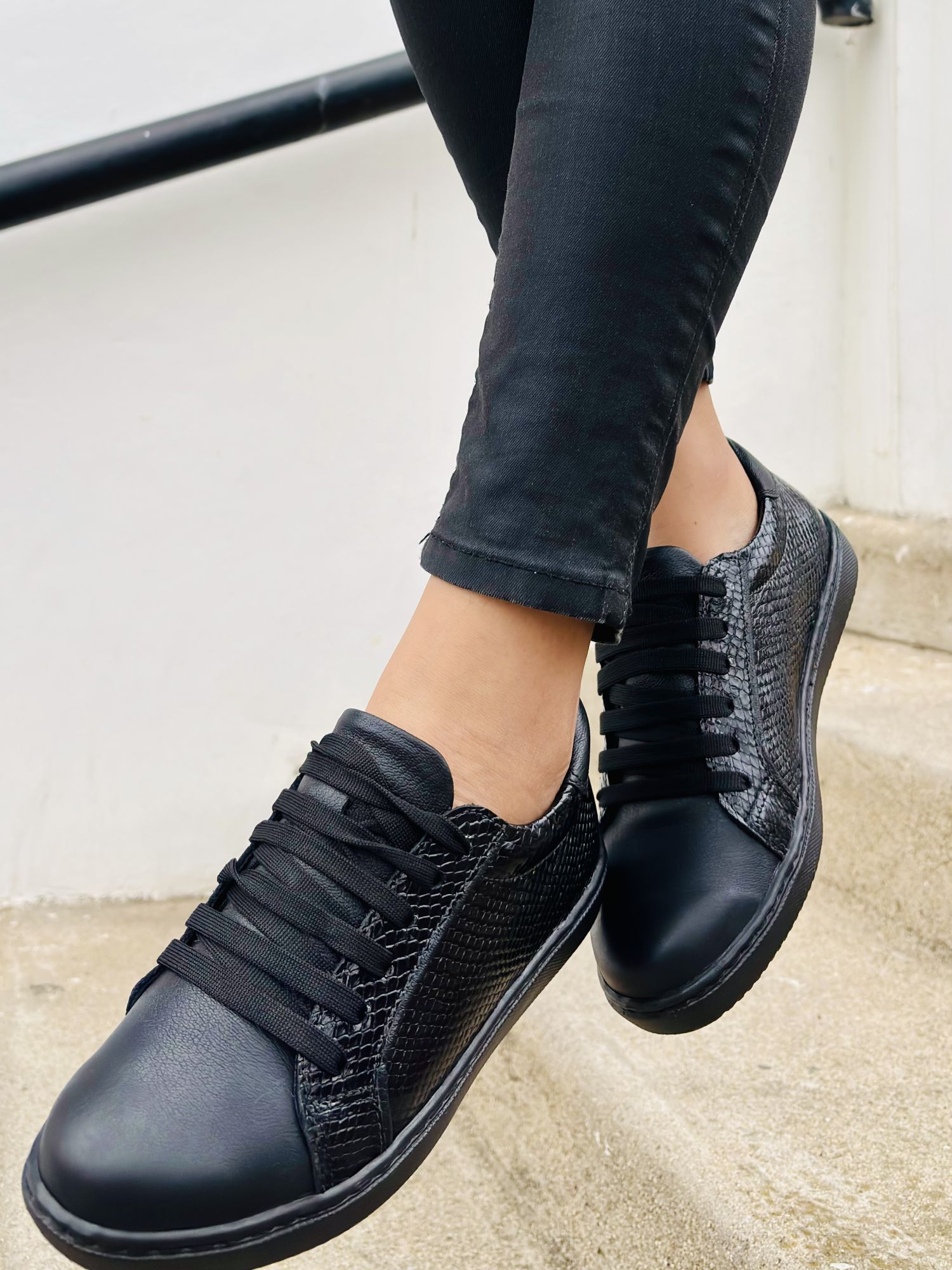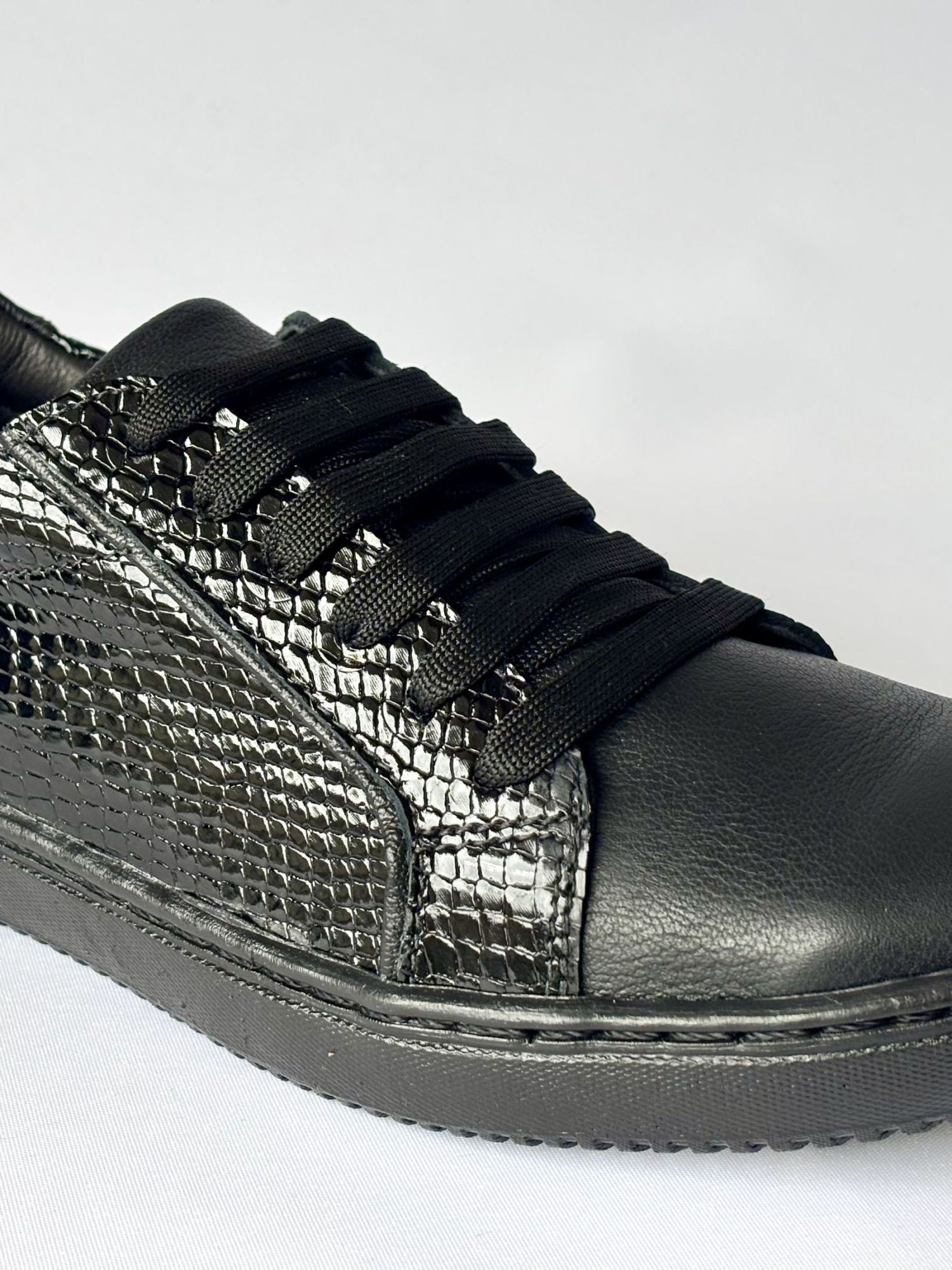 Zapatilla urbana de cuero negro con mix de texturas