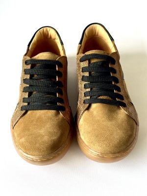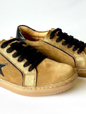 $65.691Zapatilla cuero beige con detalles en negro y gliter dorado